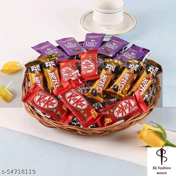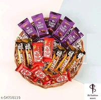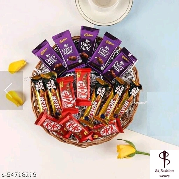 Chocolat Basket Material: Wood Product Breadth: 1 Inch Product Height: 1 Inch Product Length: 1 Inch Multipack: 1 Cadbury Dairy Milk Chocolates- 5 (12.5 grams each) Nestle Kit Kat Chocolates- 5 (12 grams each) Cadbury Five Star Chocolates- 5 (21.5 grams each) Wooden Basket Country of Origin: India