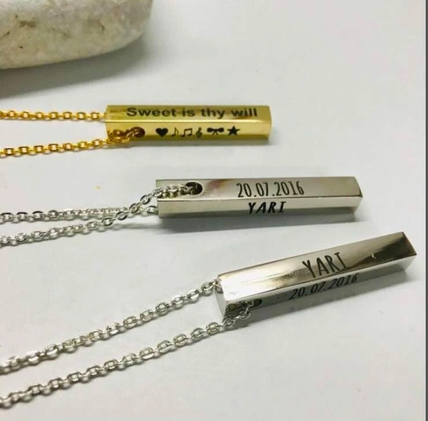 *Personalized Square Bar Name Necklace* *Brass bar pendent* *Golden + golden chain* *Black + Black chain* *Rose gold + golden Chain* *Silver + silver Chain* *One side Engraving 250* *Two side Engraving 330* *Three side Engraving 350* *Four Sides Engraving 430* *Shipping 80*